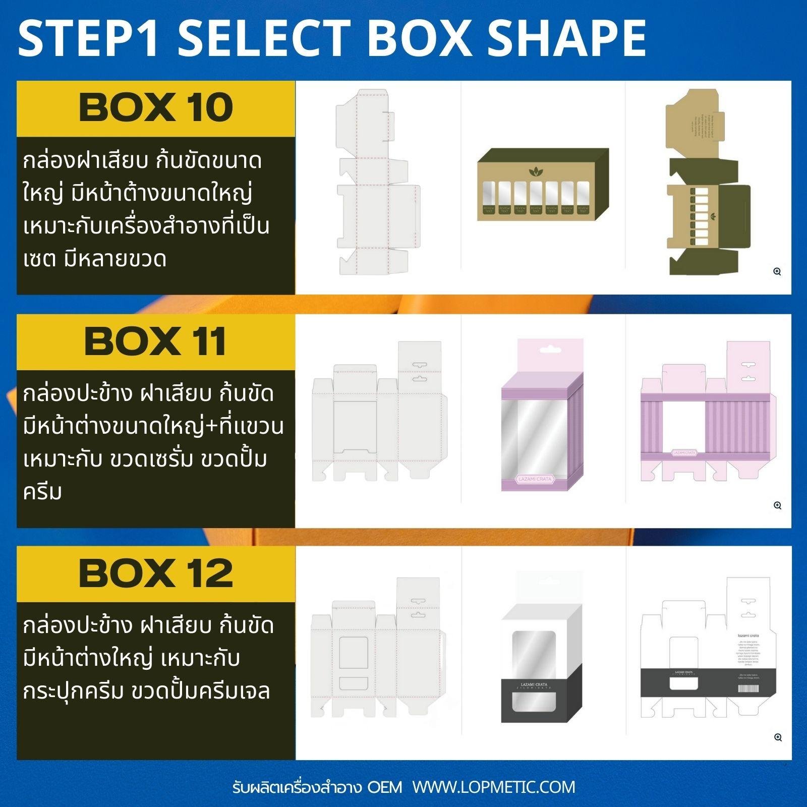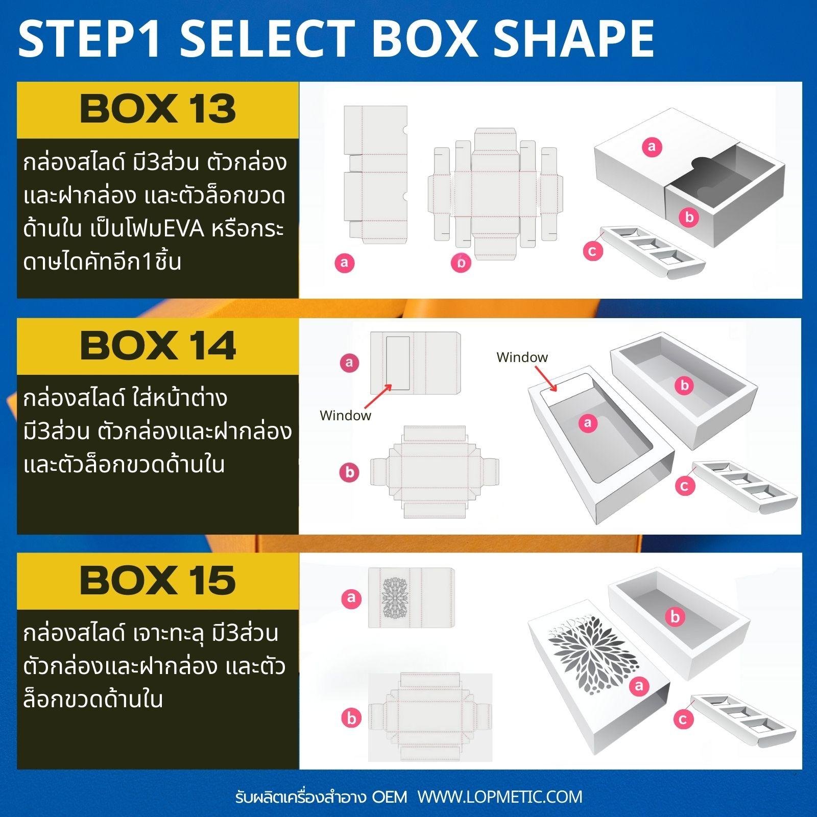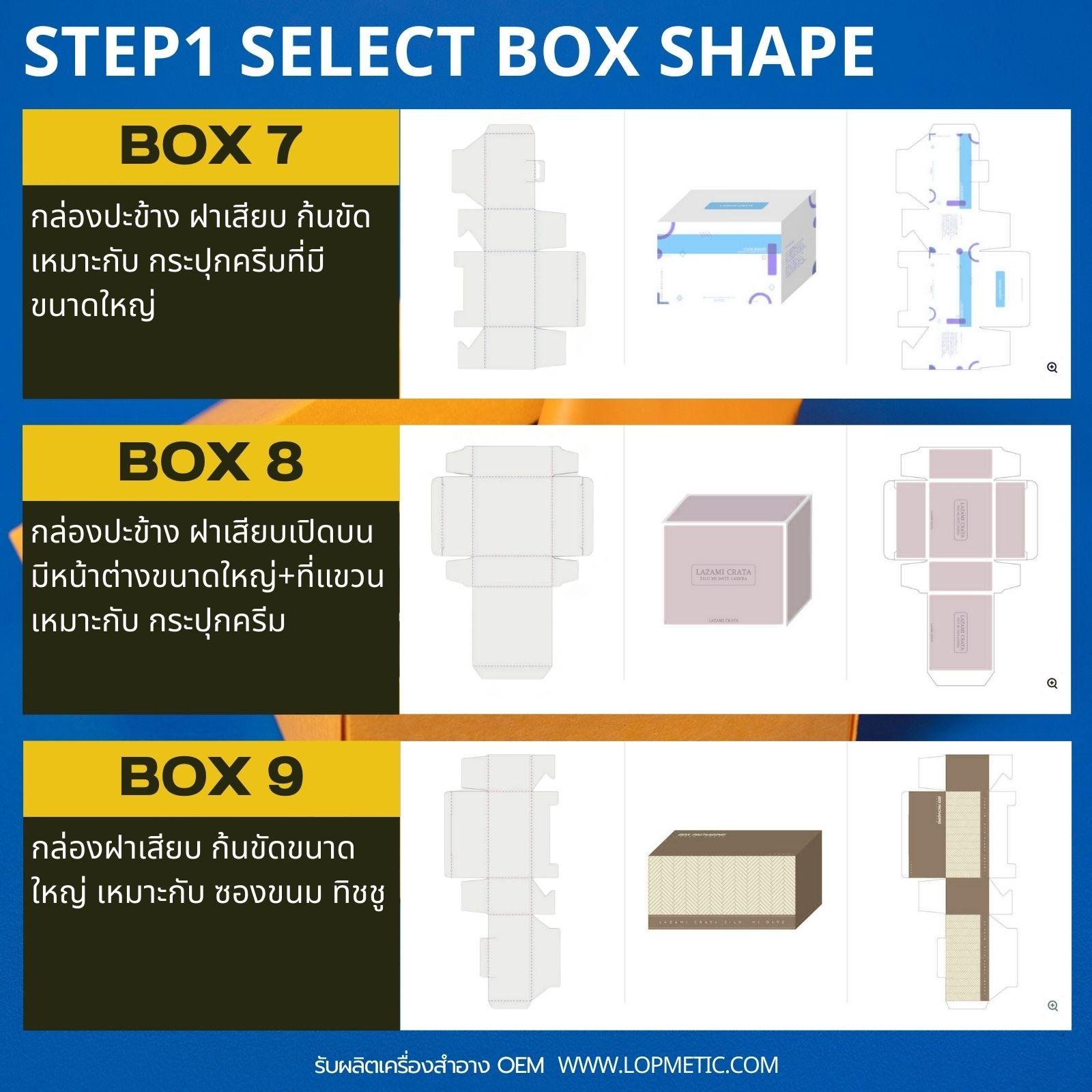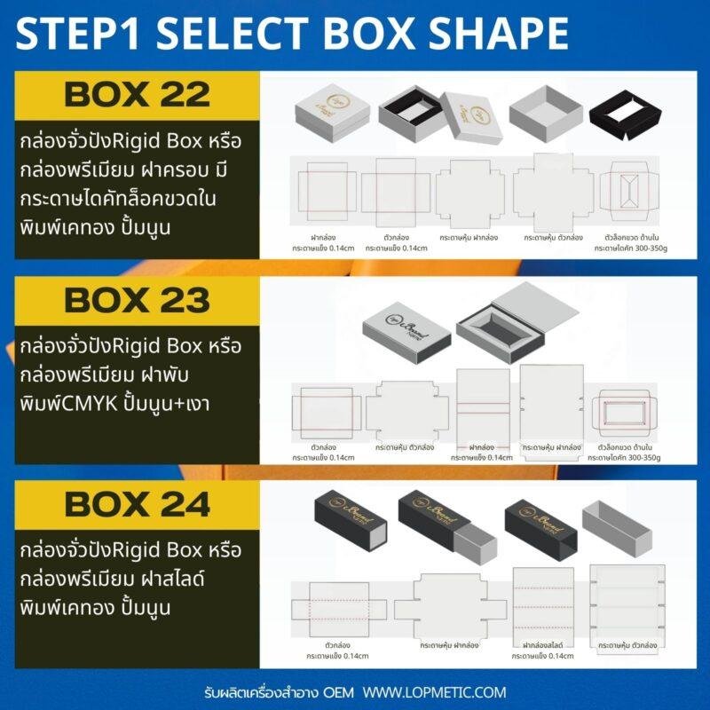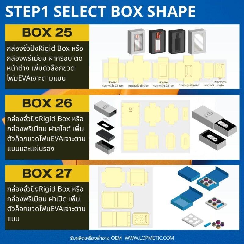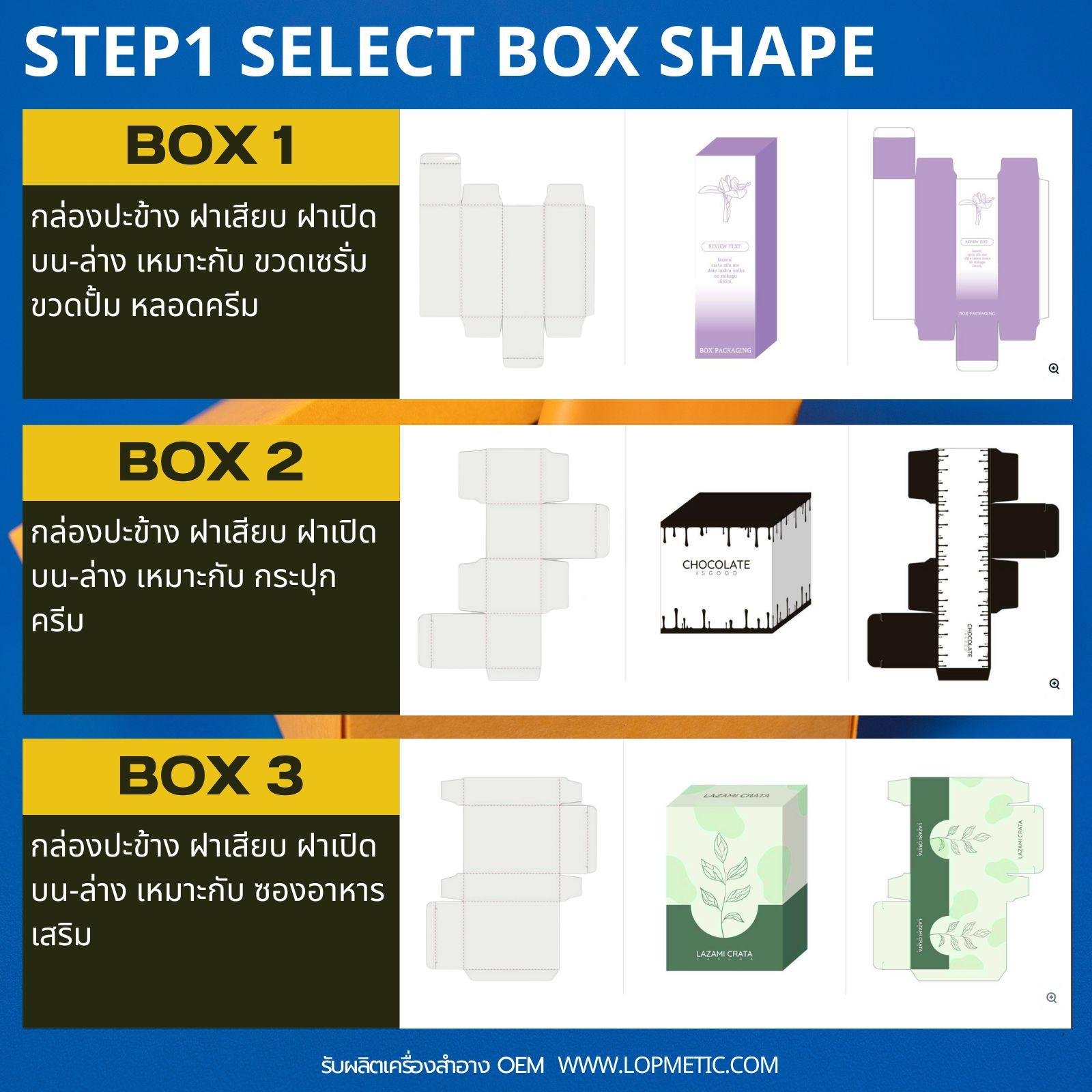 เลือกรูปทรงกล่องที่ต้องการ กล่องฝาเสียบจะมีหลายขนาด ตั้งแต่ A6-A2 แต่กล่องฝาครอบและกล่องสไลด์ ส่วนใหญ่จะมีขนาด A3-A2เท่านั้น เพราะต้องใช้กระดาษ2-3ส่วน ประกอบเป็นกล่อง1ใบ จึงมีราคาแพงกว่ามาก