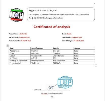 ไม่เหนียวเหนอะหนะ แอลกอฮอล์เกรดอาหาร Food Grade ระเหยง่าย แห้งเร็ว ไม่ทิ้งคราบเนื้อเจลฆ่าเชื้อโรคและแบคทีเรียได้ 99.99%มีความเข้มข้นของแอลกอฮอล์ 70%-75%ออกเอกสาร CoA และ MSDS และCFSเพื่อส่งออกได้ มีผลทดสอบเชื้อ BN1276 ใช้กับหน่วยงานราชการ