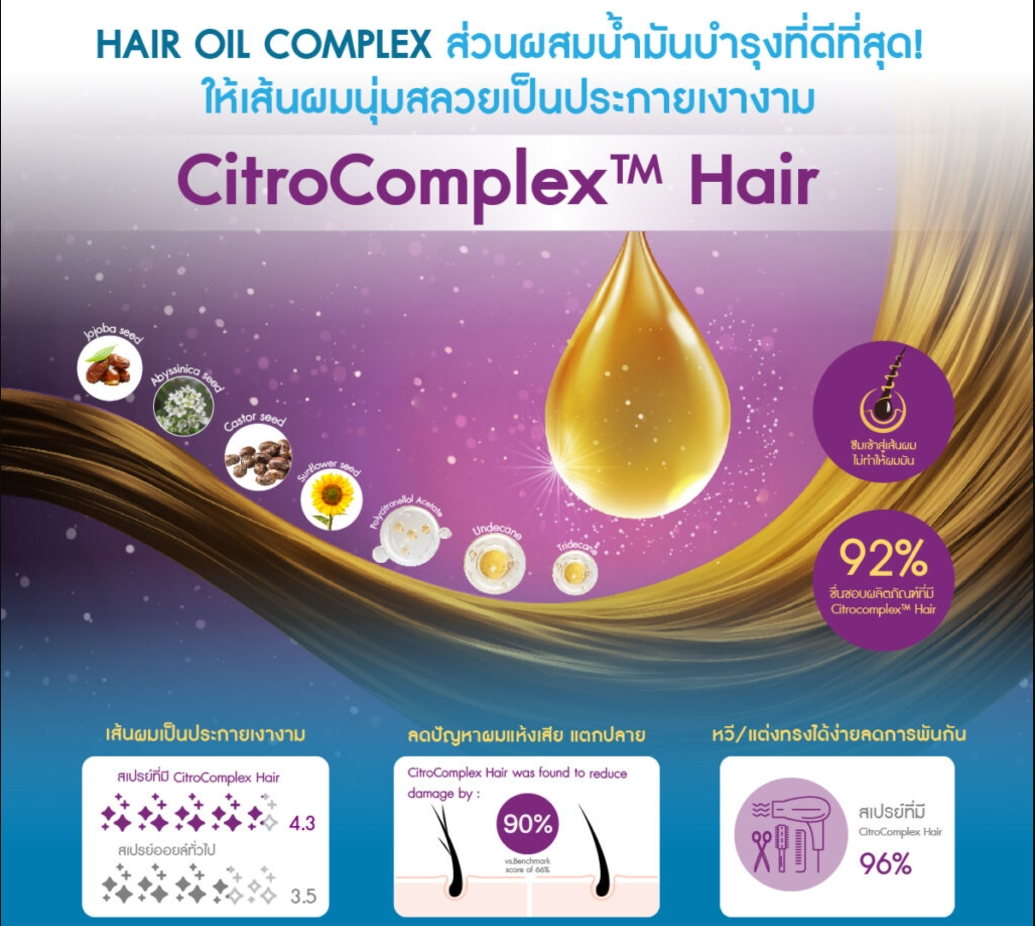จากส่วนประกอบ Hair Oil Complex องค์ประกอบของน้ำมันที่ได้รับการคิดค้นว่าสามารถที่จะช่วยบำรุงเส้นผมได้ดีที่สุด ช่วยให้เส้นผมเป็นประกายเงางามสุขภาพดี ปกป้องเส้นผมจากแสงแดดและความร้อน ลดการชี ฟู ช่วยให้การหวีและจัดแต่งทรงเป็นเรื่องง่าย และยังเป็นเนื้อ Oil ที่บางเบา สบายผมไม่ทำให้ผมมันหรือเหนียวเหนอะหนะด้วยคุณสมบัติที่โดดเด่นนี จึงทำให้ CitroComplex Hair ได้รับความชื่นชอบจากผู้ใช้มากถึง 92% เมื่อเทียบกับผลิตภัณฑ์ในท้องตลาด