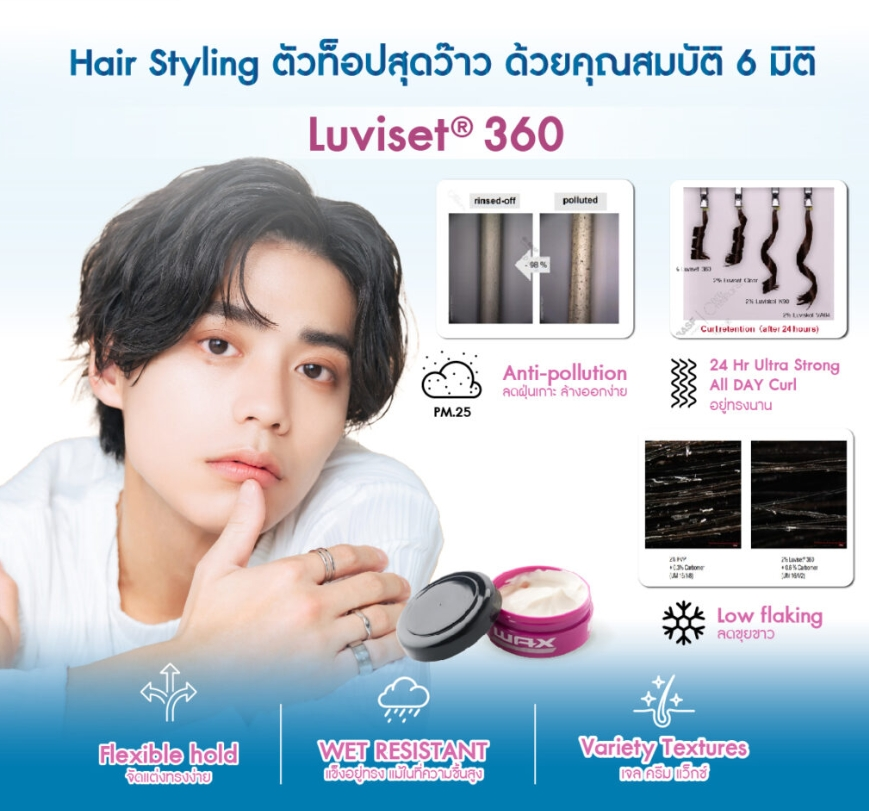 2. LUVISET 360 (Styling Polymer) จากประเทศเยอรมนี (GERMANY) คือโพลีเมอร์จัดแต่งทรงที่มีนวัตกรรมที่ให้ประสิทธิภาพใน 6 มิติ ได้แก่ ยึดเกาะได้ยาวนาน ยึดเกาะได้ดี หลุดล่อนต่ำ ยึดเกาะได้ยืดหยุ่น ป้องกันมลภาวะ และให้สัมผัสใหม่ สามารถสร้างผลิตภัณฑ์จัดแต่งทรงผมที่มีความหนืดสูงโดยที่จะไม่ทำให้ตัวผลิตภัณฑ์ไหลไปมาในบรรจุภัณฑ์ ทั้งในผลิตภัณฑ์ประเภท เจล ครีม แว็กซ์ และเนื้อใหม่ๆ