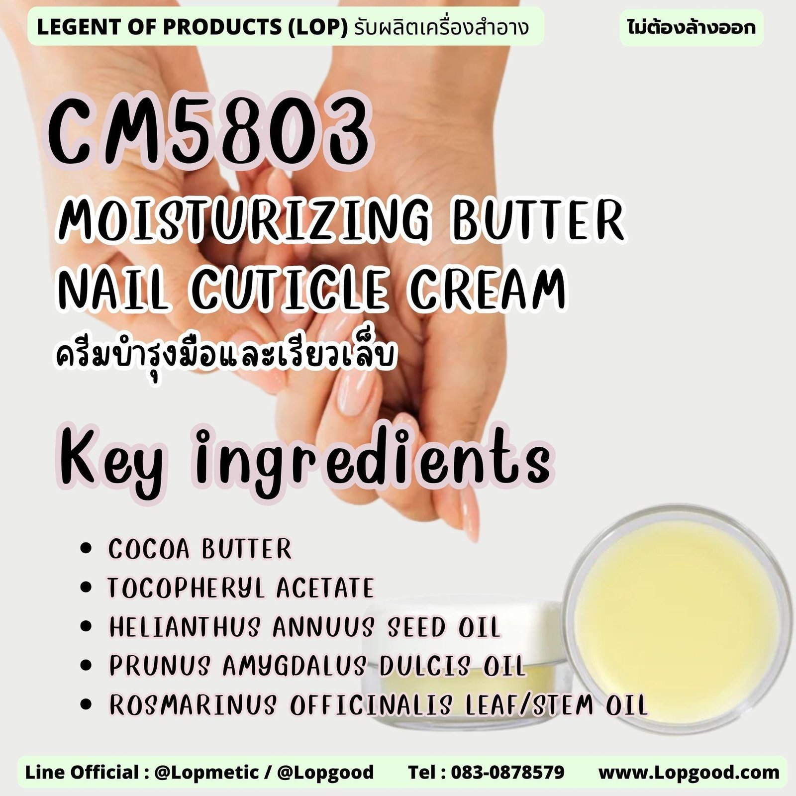 Keyword : รับผลิต MOISTURIZING BUTTER NAIL CUTICLE CREAM รับผลิตครีมบำรุงมือและเรียวเล็บ , โรงงานรับผลิตครีมบำรุงมือและเรียวเล็บ