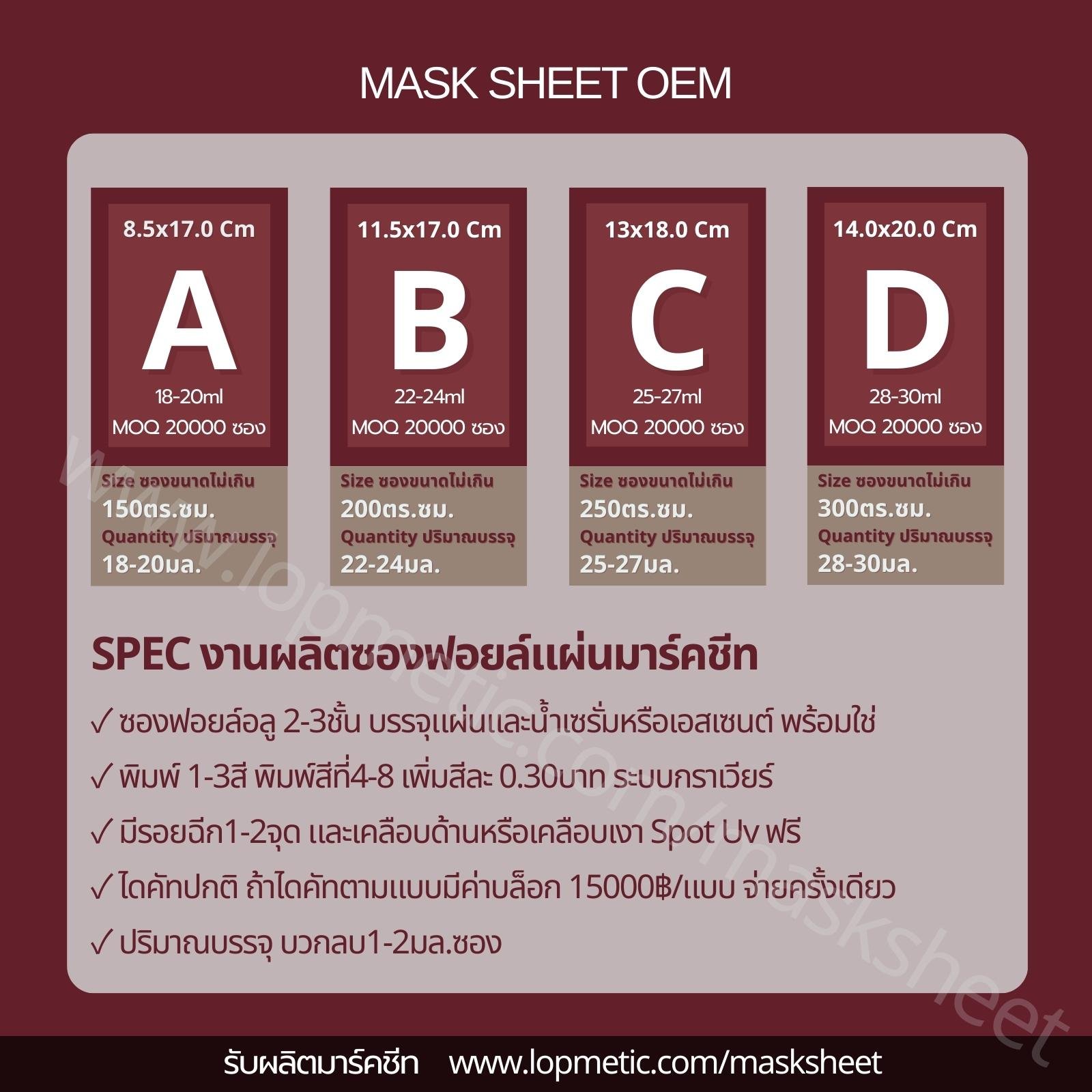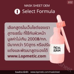 การสั่งผลิตMask Sheet หรือแผ่นมาร์คหน้า สามารถพัฒนาสูตรหรือแกะสูตรใหม่ได้ มีค่าใช้จ่ายในการแกะและพัฒนาสูตร 5000บาท มีรายละเอียดดังรรูปด้านล่าง