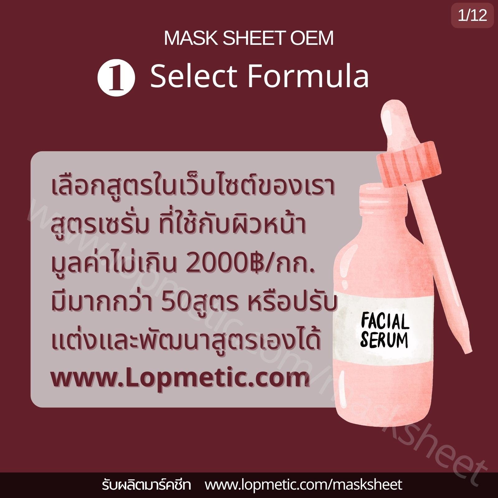 1.เลือกสูตรเซรั่มบำรุงผิวหน้า จากหน้าเว็บของเรา สูตรที่ราคาไม่เกิน 2000฿/กก. ได้ทุกสูตร สูตรจะอ้างอิงสรรพคุณและสารสกัดตามหน้าเว็บ แต่จะปรับสูตรให้เหมาะสมกับการใช้กับแผ่นมาร์คหน้า Link Mask Sheet Formula