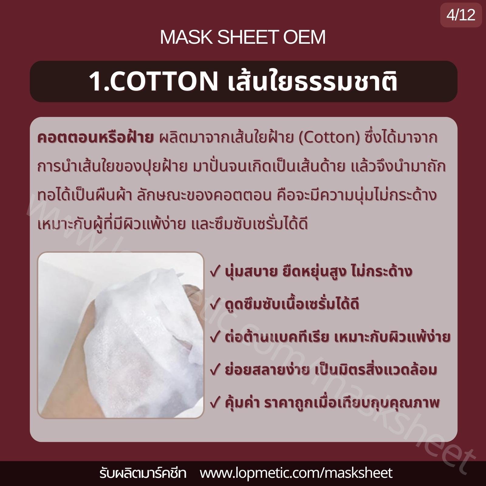 Mask Cotton คอตตอนหรือผ้าฝ้าย 100% ผลิตมาจากเส้นใยฝ้าย (Cotton) ซึ่งได้มาจากการนำเส้นใยของปุย ฝ้าย มาปันจนเกิดเป็นเส้นด้าย แล้วจึงนำมาถักทอได้เป็นผืนผ้า ซึ่งคุณภาพทีี่ได้ก็จะ แตกต่างกันออกไป ขึ้นอยู ่กับการเรียงตัวกันของเส้นด้าย ความหนาของเส้นด้าย และอาจจะเกี่ยวกับความบริสุทธิ์ของเส้นด้ายด้วย ลักษณะของคอตตอน คือจะมีความนุุ่มไม่กระด้าง เหมาะกับผู้ที่มีผิวแพ้ง่าย และซึมซับเนื้อเซรั่มได้ดี Cotton นั้นเน้นที่คุณภาพและความคุ้มค่าต่อราคา