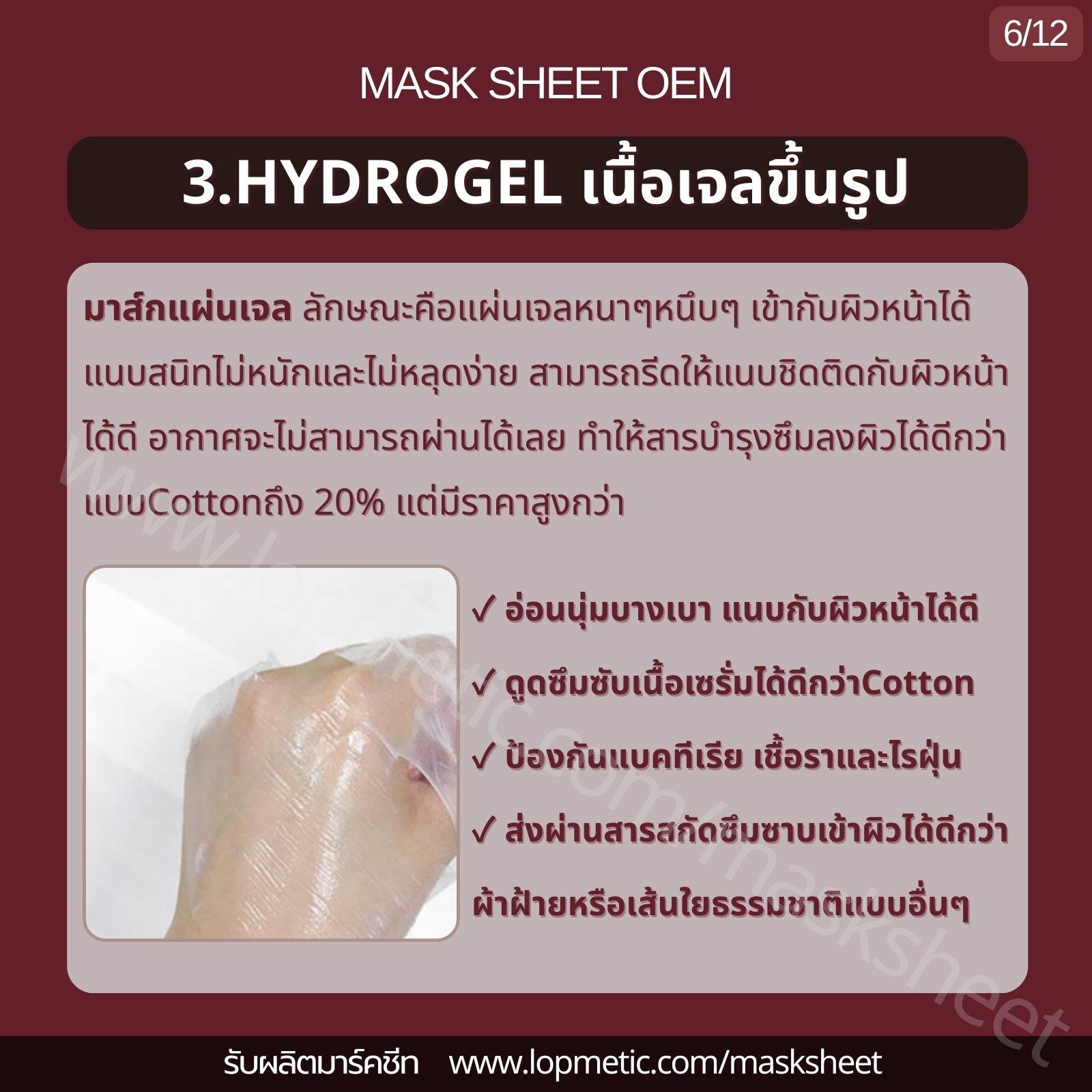 Mask Hydro Gel แผ่นมาส์กเจลขึ้นรูป ลักษณะคือแผ่นเจลหนาๆ จะหนึบๆ เข้ากับผิวหน้าได้ดีไม่หนักและไม่หลุดง่าย สามารถรีดให้แนบชิดติดกับผิวหน้า อากาศไม่สามารถผ่านได้เลย ทำให้สารบำรุงละลายลงผิวได้100% สารสกัดซึมลงผิวได้ดีกว่าแบบกระดาษหรือแบบผ้าถึง 20%